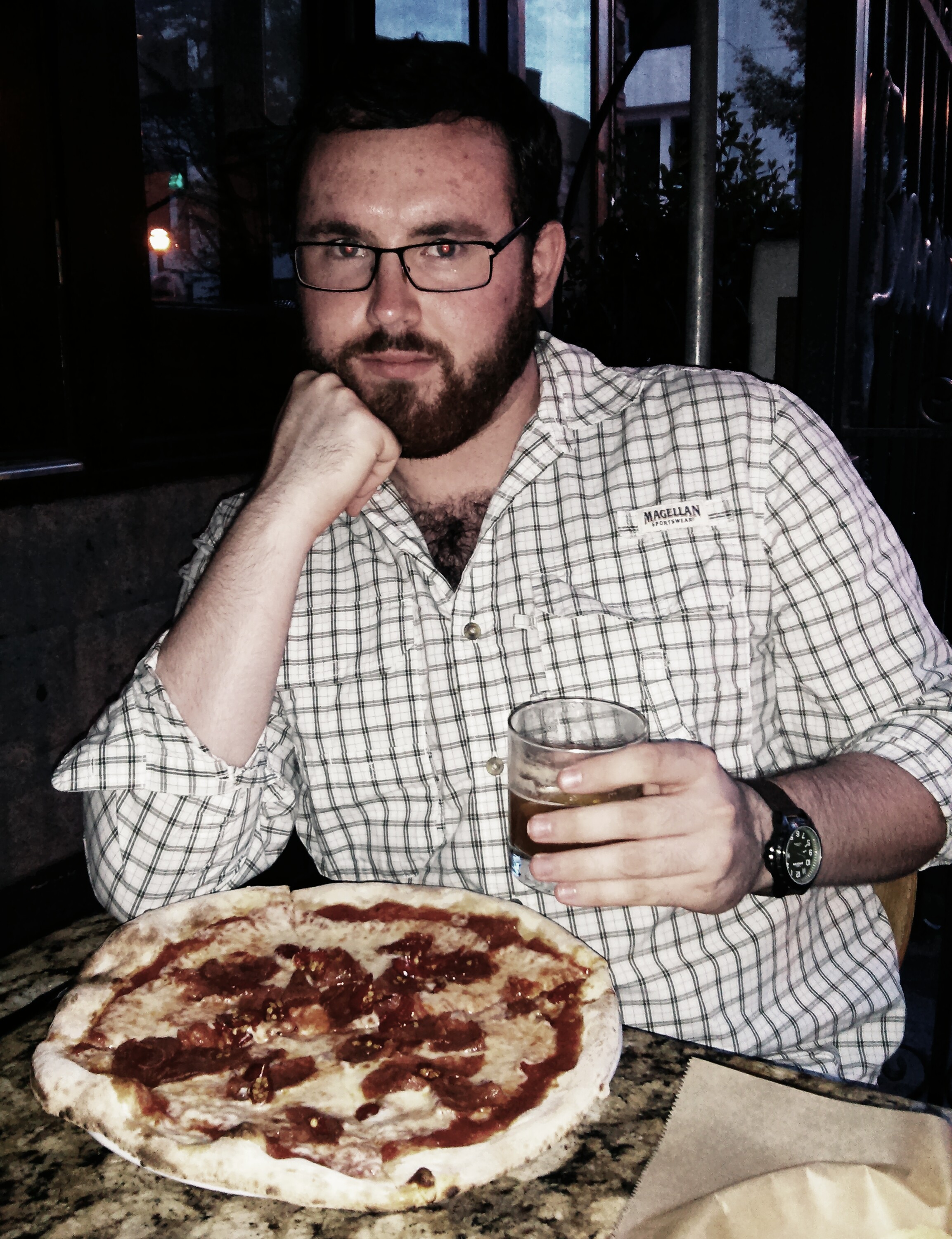 jon had decided on pizza that night and was pleasantly surprised when it was placed in front of him. i think we were all expecting a modest, personal-sized pizza, but this bad boy was certainly large enough to share. the fra diavolo pizza was hot and spicy due to the spicy salami and calabrese peppers, but it was just what jon was craving that night.