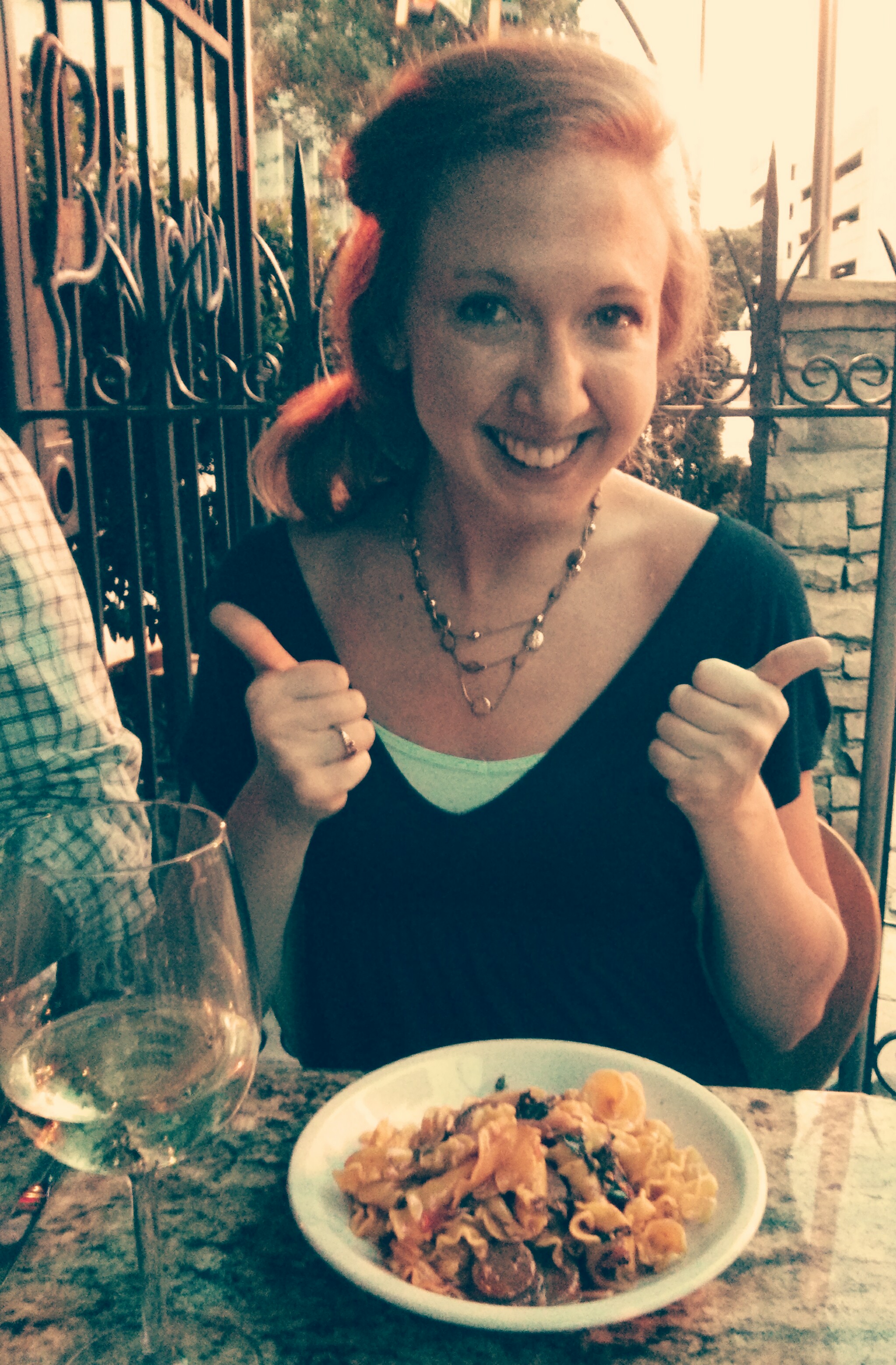 after being seated on the patio (you all know how i love to eat outside when the weather is right), our waiter for the evening oscar greeted us kindly. i think he could sense we were a lively bunch because he wasted no time getting our drink orders. i had already decided on the ravioli for my entrée, so in true kelsey fashion, i asked for a red wine that would pair with it well. oscar considered the drink menu for a moment and then suggested the cherry tart wine. “i’ll take it!” i declared. sometimes life is brilliantly simple. the rest of the table ordered as well and then oscar was off to tend to our spirits.
