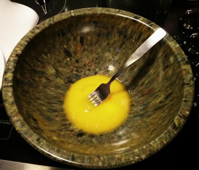 in medium bowl, beat egg yolks with fork; set aside.
