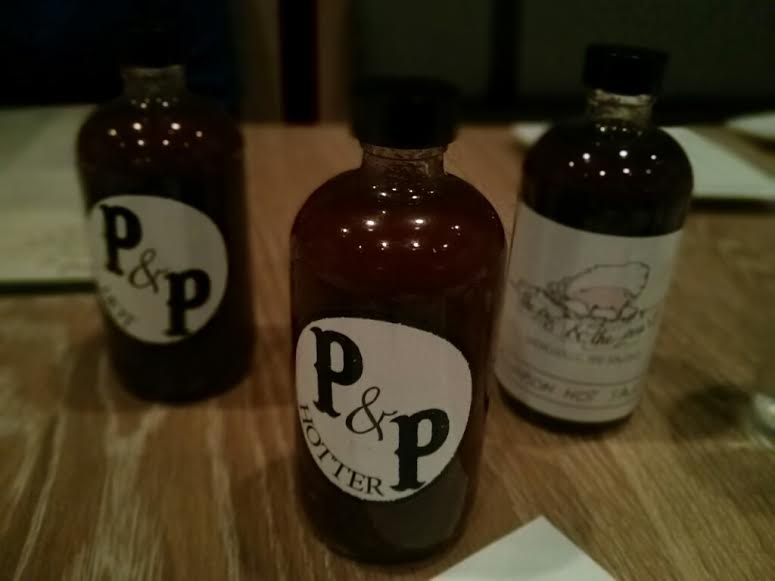 speaking of condiments, the sauces they have here at the pig & the pearl are not truly bbq sauces, which is what you might be expecting. they really are hot sauces, vinegary and thin hot sauces that really add just a little bit of flavor without being overpowering.