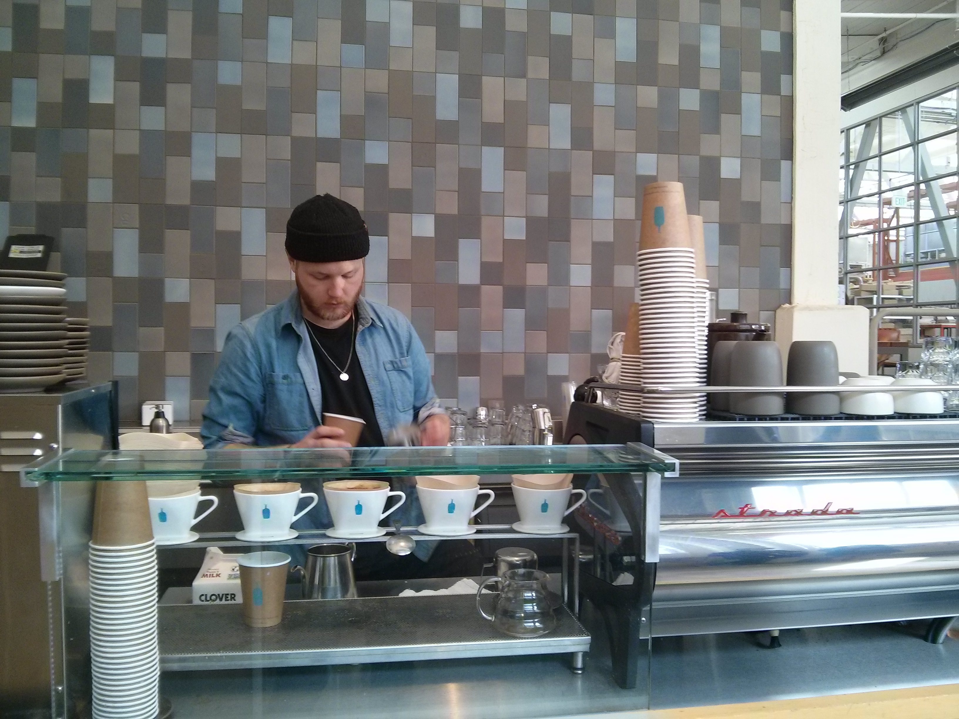 i hopped in line with the other customers. in an effort to find my favorite coffee place in san francisco, i ordered a cafe au lait here as well so that i could have an apples-to-apples comparison. smart thinkin’, kels! here at blue bottle, they use the pour-over drip method to produce a complex yet delicate coffee flavor.