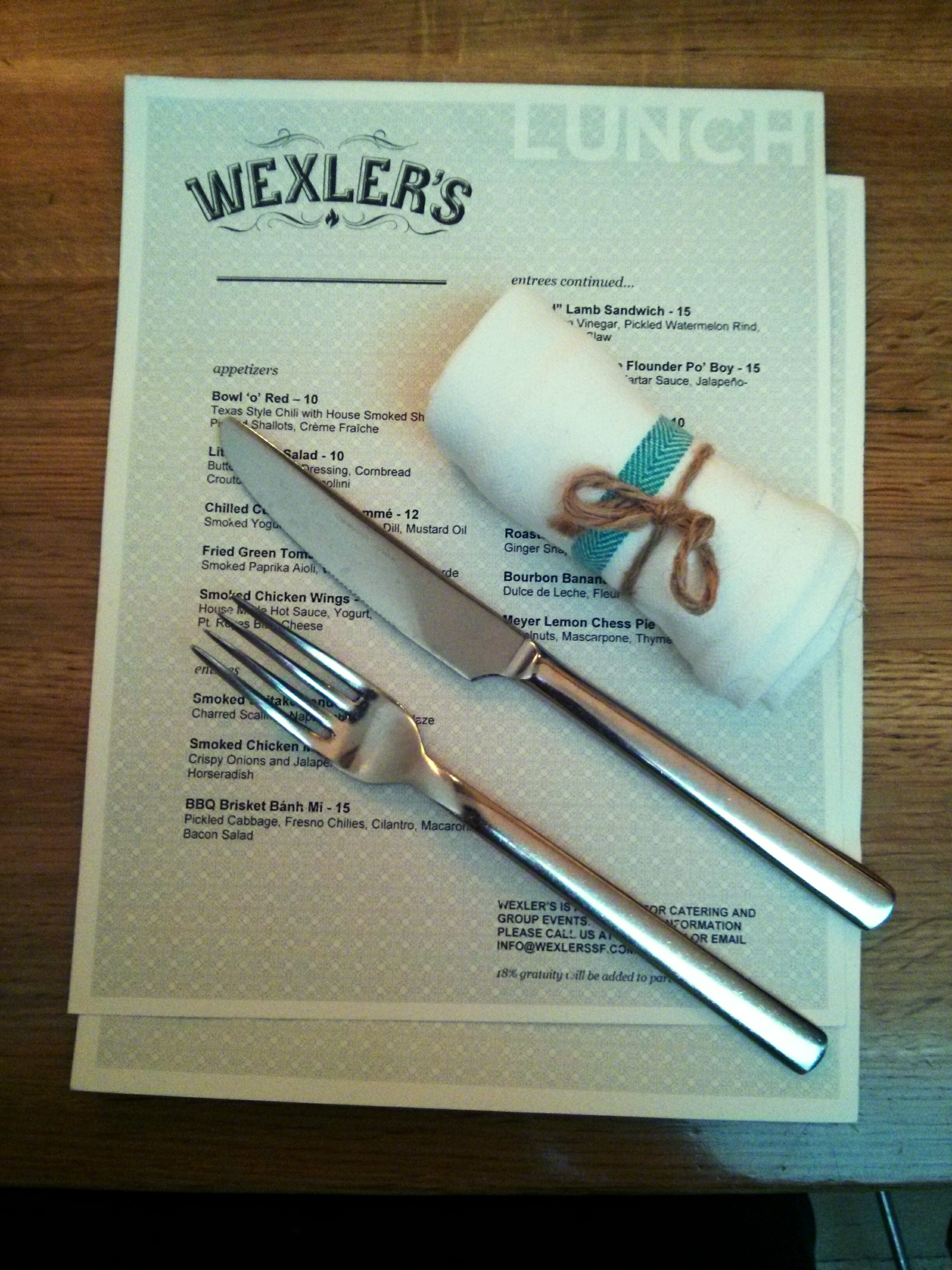 i got my bearings once i was back above ground, and with more friends’ suggestions, i found my way to wexler’s for a light lunch. this little place my good friend brian recommended was packed with the local lunch crowd, but to my luck, they had a single seat at the bar available. it’s like they knew i was coming! i bumped my way to my stool and was kindly greeted by josh the bartender with a glass of water. since i’m not on the clock the tiniest bit today, an afternoon drink was a no-brainer. i requested the north coast brewery’s “pranqster” golden ale from fort bragg, ca. oh man, it was so good. you gotta support and love the local breweries, especially with something that has a “floral nose, full fruity flavor, and clean finish.” if i had a trained beer palette, i’m sure those are all the things i would say, and in my expert drinking opinion, it’s an excellent beer that i would readily recommend to a friend and happily order again myself. i’ll say, though, one beer was plenty for the afternoon, because at 7.6%, i was feeling pretty great after just the one.