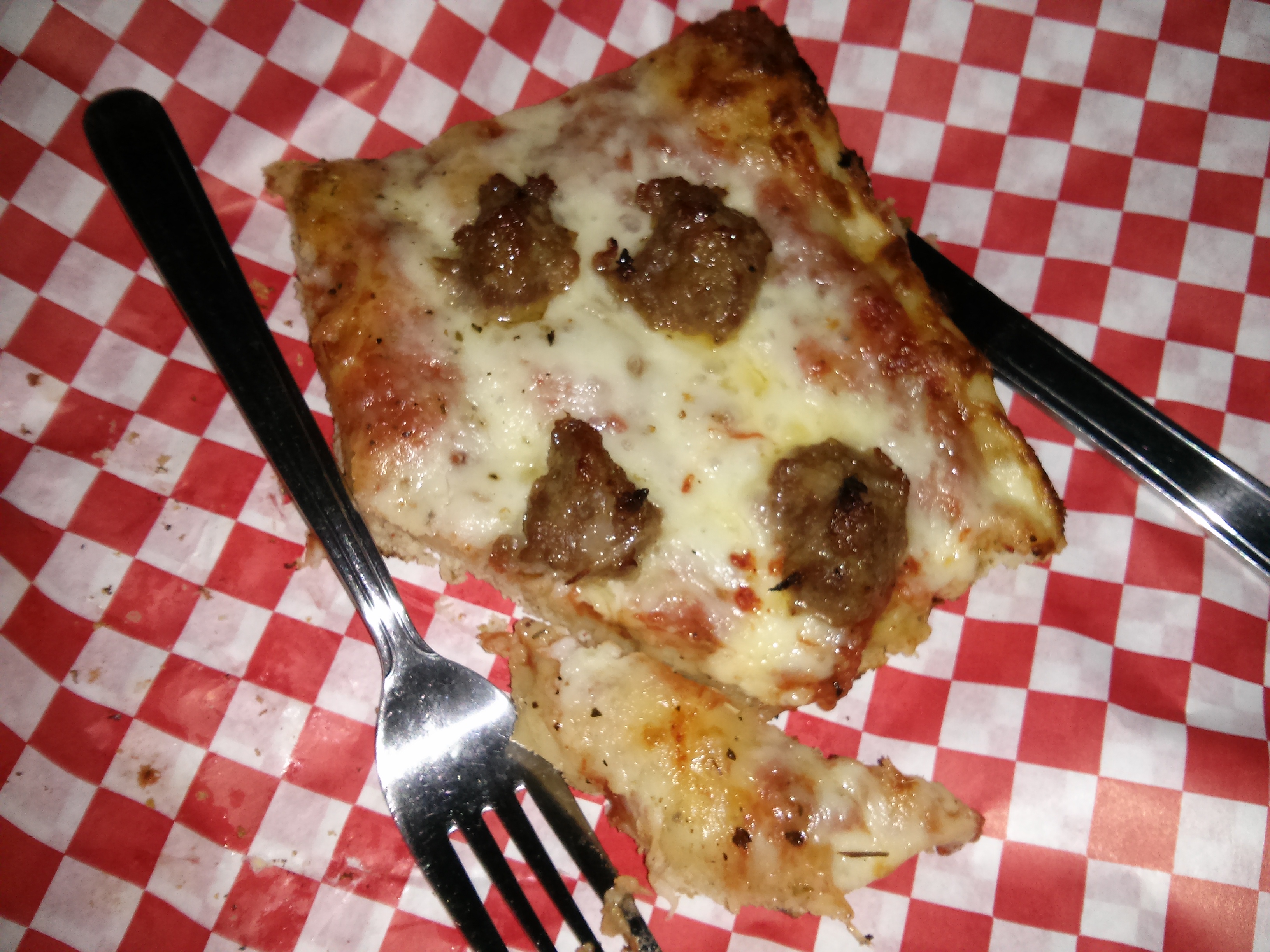 the employees here at golden boy are incredibly friendly, good people just making some good food. although thin slice new york style ‘za is my favorite, i was loving this thicker crust sausage. the sausage was a teensy bit spicy but balanced out by the creamy cheese. the crust was crispy and the dough was not too heavy. for only three bucks, i can see why garth was quick to recommend this local pizza joint. thanks, bud!