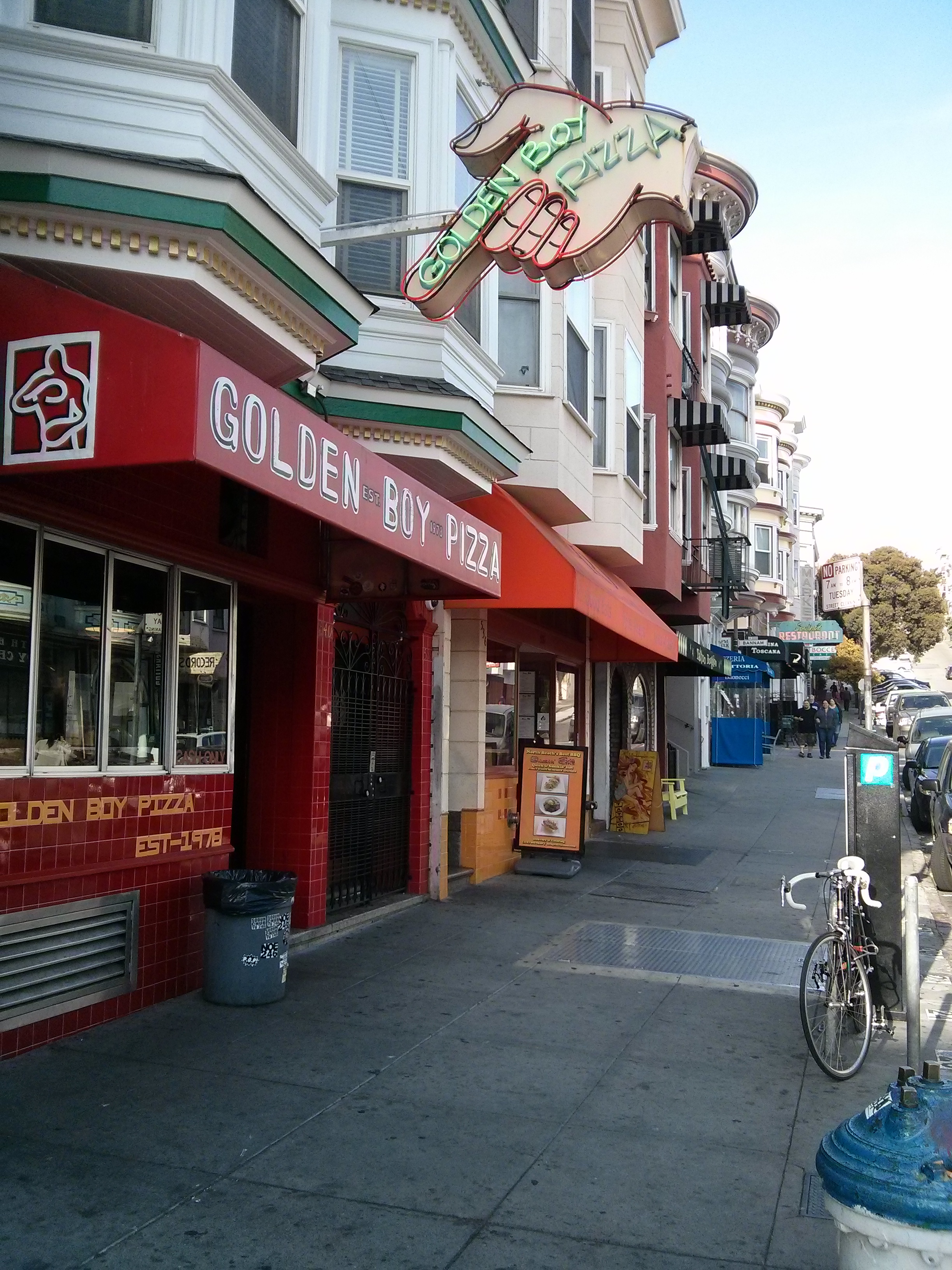 with that decision made, i turned south on columbus to head back into the city. next up on the eating tour was a place called golden boy pizza, a suggestion from my well-traveled friend garth. he’s been all over the states, and the world for that matter, and i wanted to try and fit a slice in before the trip was done. after a couple wrong turns, i was happy to find their large sign pointing me right into their front entrance. ah, a little rest for the weary tourist!