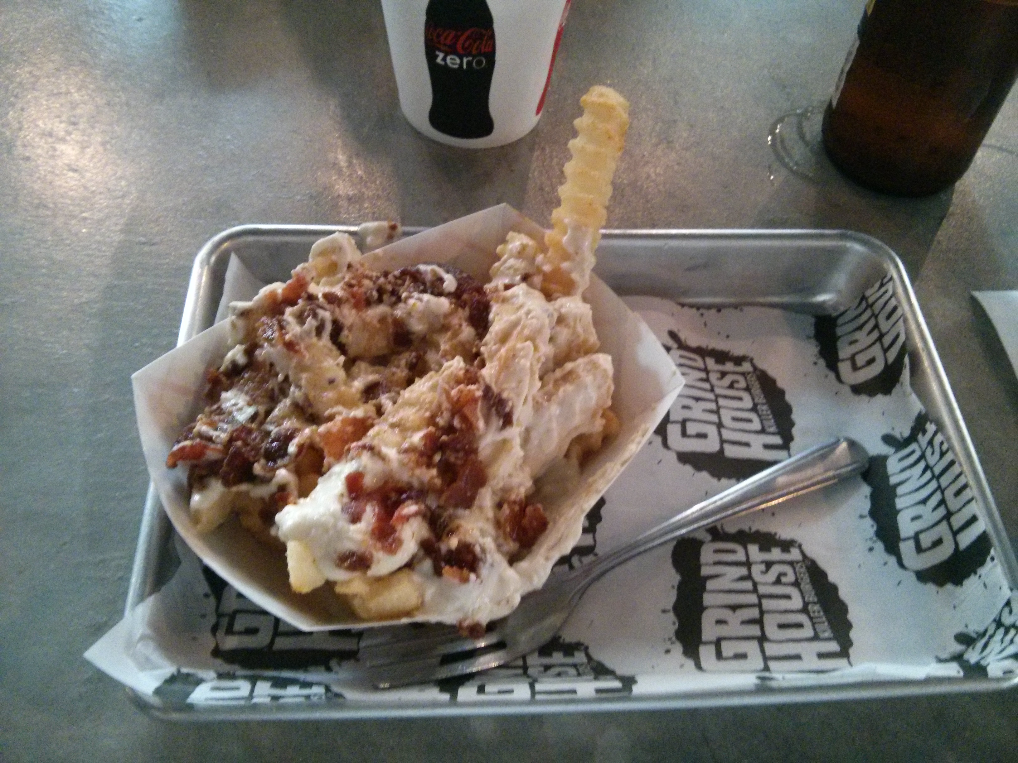 we supplemented our liquid diets that afternoon with plenty of food as well. i started with an order of french fries topped with bacon and bleu cheese sauce. ooh, girl, you would think i had died and gone to heaven. the crinkle fries were the perfect choice for the bacon and bleu cheese, and i am telling you now, if you do not like bleu cheese, these fries are not for you. i could have gone for a quick swim in that tiny little boat of starchy, salty goodness.